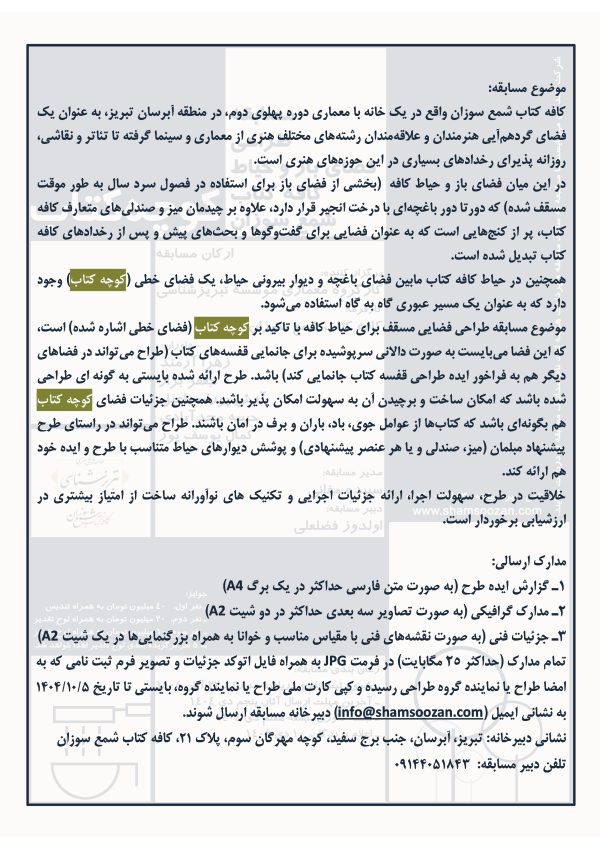 مسابقه طراحی فضای باز و حیاط کافه کتاب شمع سوزان